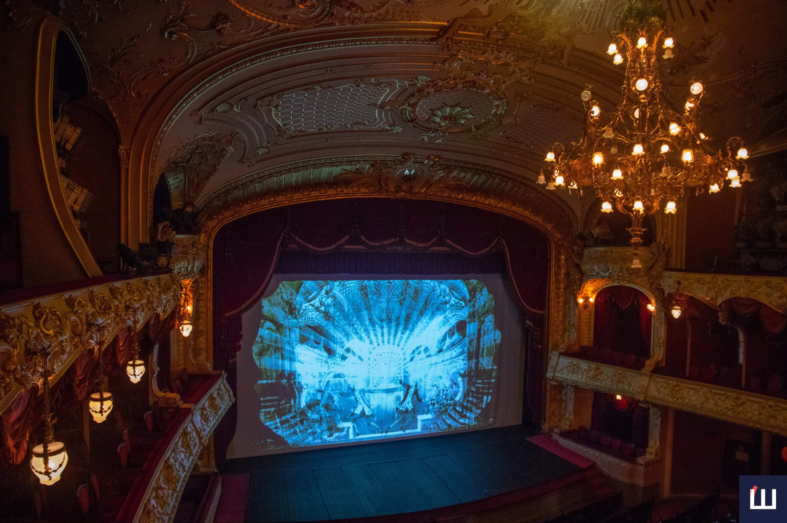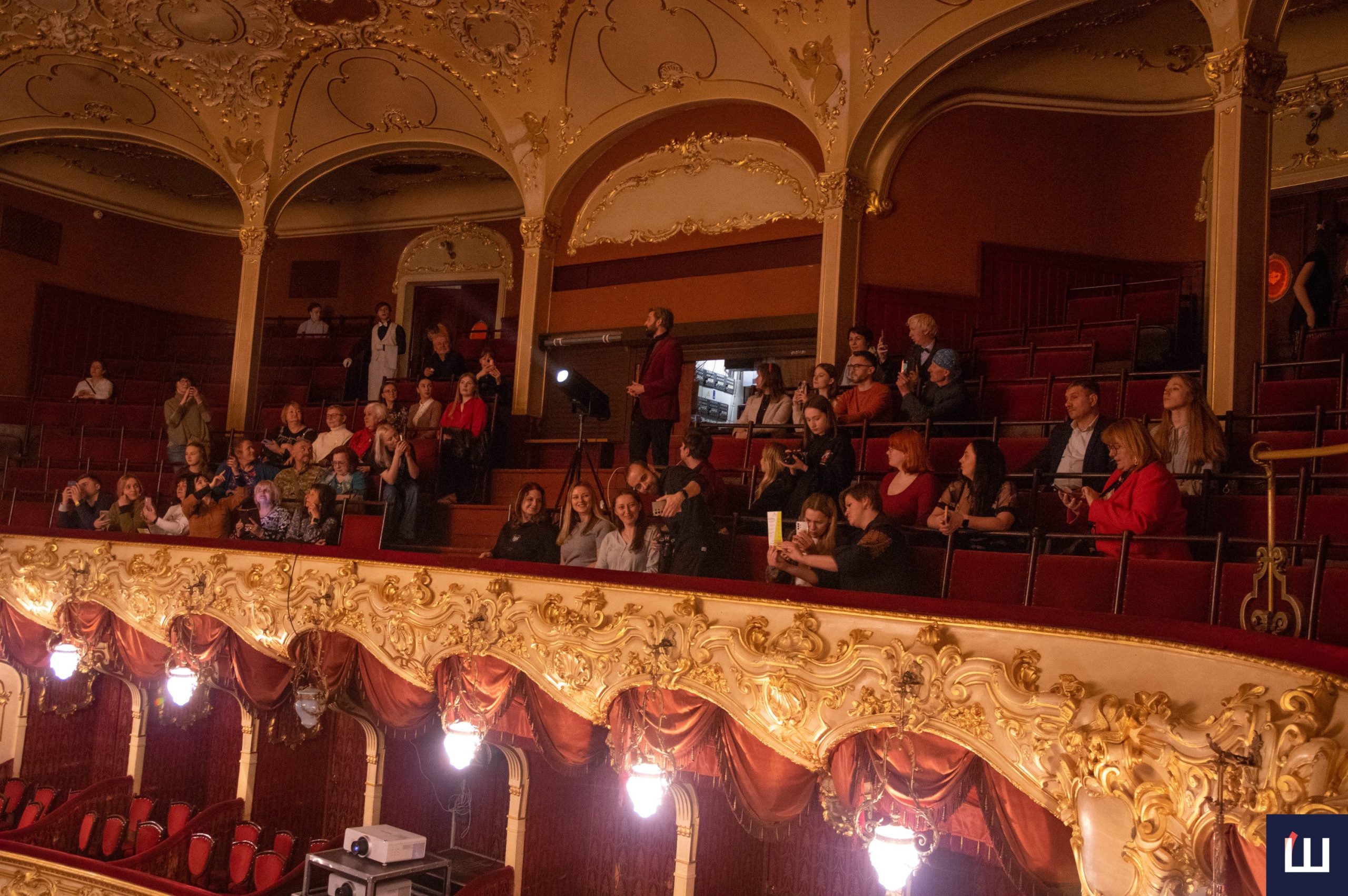 Тур продовжується в амфітеатрі, де директор спочатку знайомить із наявними та втраченими завісами, а згодом за допомогою прожектора підсвічує елементи ліпнини та приховані підписи майстрів на стелі зали.