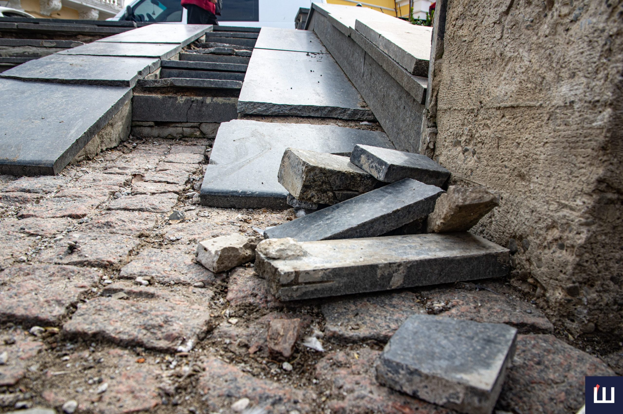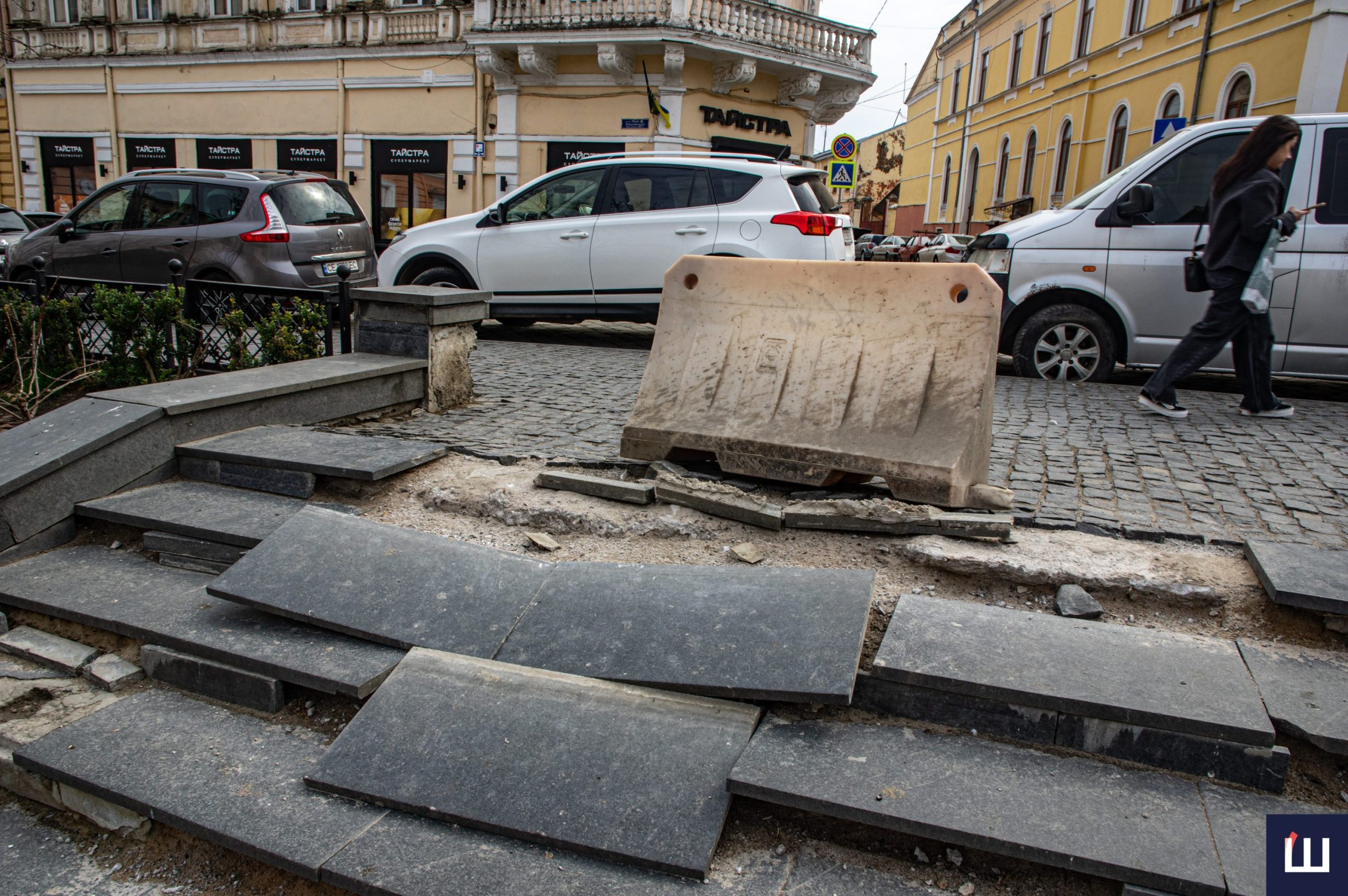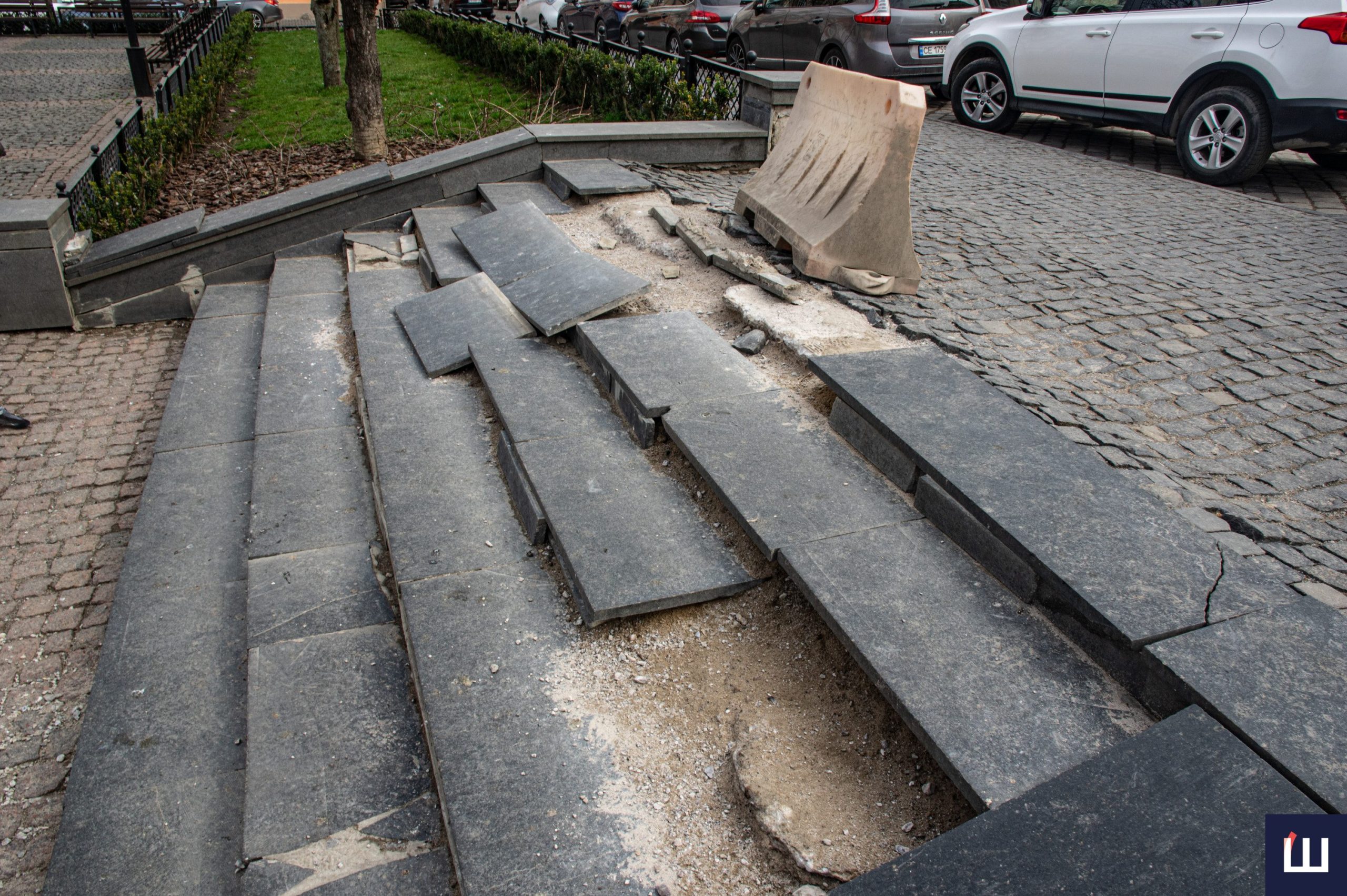 У центрі Чернівців майже повністю зруйновані сходи на площі Філармонії. Деякі плити повністю зняті, інша частина – на місці, але пошкоджені перегородки, які зʼєднують сходинки між собою.