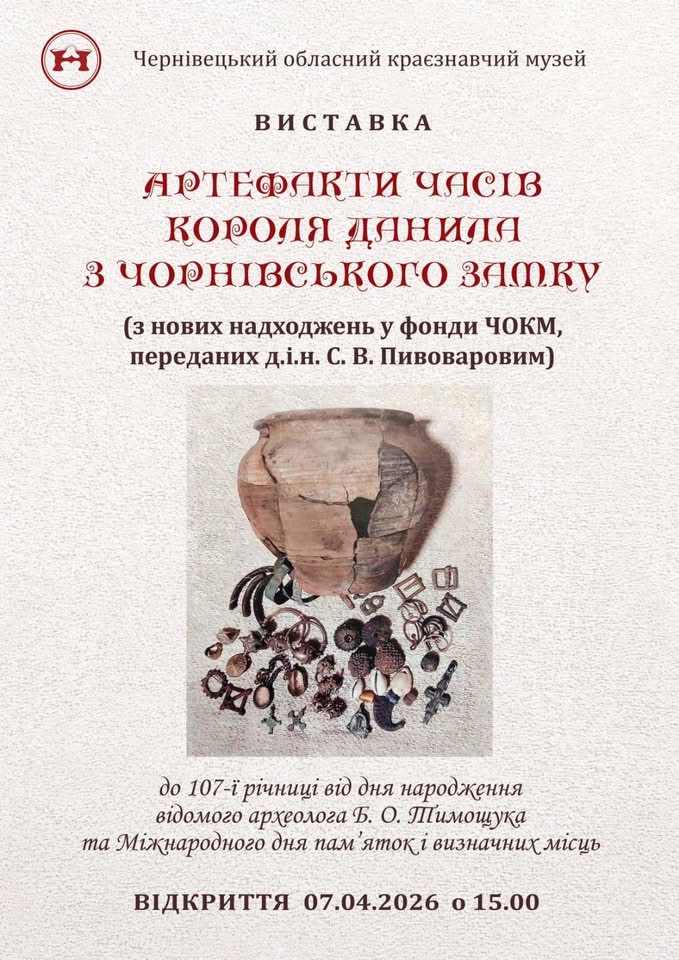 7 квітня о 15:00 у Чернівецькому обласному краєзнавчому музеї відбудеться відкриття виставки «Артефакти часів короля Данила з Чорнівського замку». Експозицію сформовано з нових надходжень до фондів музею, переданих доктором історичних наук Сергієм Пивоваровим.
