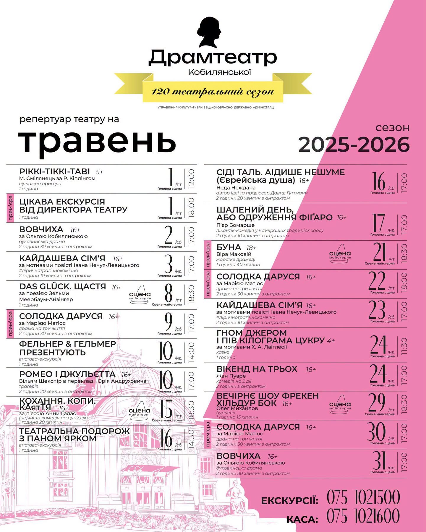 У травні Чернівецький музично-драматичний театр імені Ольги Кобилянської підготував насичену афішу з прем’єрними показами та вже знаними постановками.