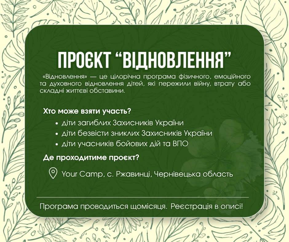Фонд «Твоя Допомога ЮА» розпочав цілорічний проєкт «Відновлення», спрямований на психологічну підтримку та реабілітацію дітей, які пережили війну або складні життєві обставини. Програма реалізується на базі дитячого табору Your Camp у селі Ржавинці Чернівецької області у співпраці з державними структурами та благодійними організаціями.